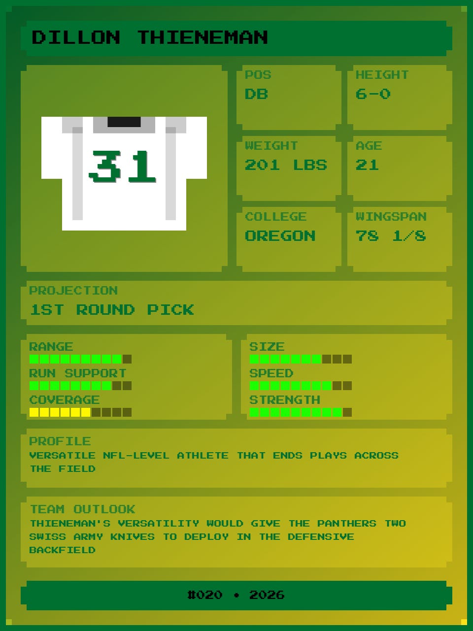 Oregon’s Dillon Thieneman is the remainder of the three, and might just be the perfect fit for the Panthers. Let’s take a look at the dynamic Duck safety.