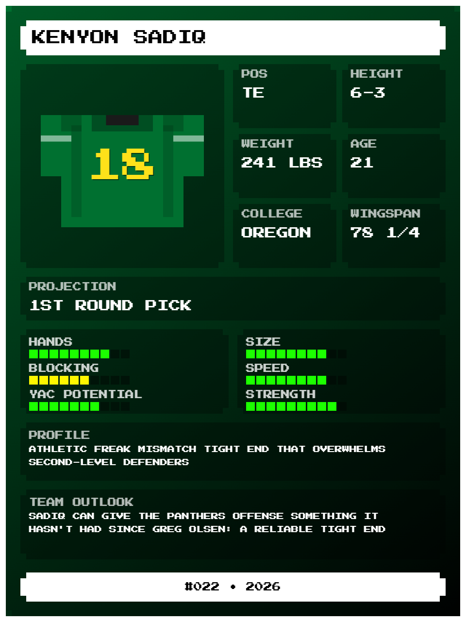 Perhaps more worrisome in this regard is that fellow Oregon tight end Jamari Johnson seemed to outproduce Sadiq down the stretch of the season, adding 190 yards and 2 touchdowns on 9 receptions compared to Sadiq’s 70 yards, 0 touchdowns, and 11 catches during Oregon’s three playoff matchups.