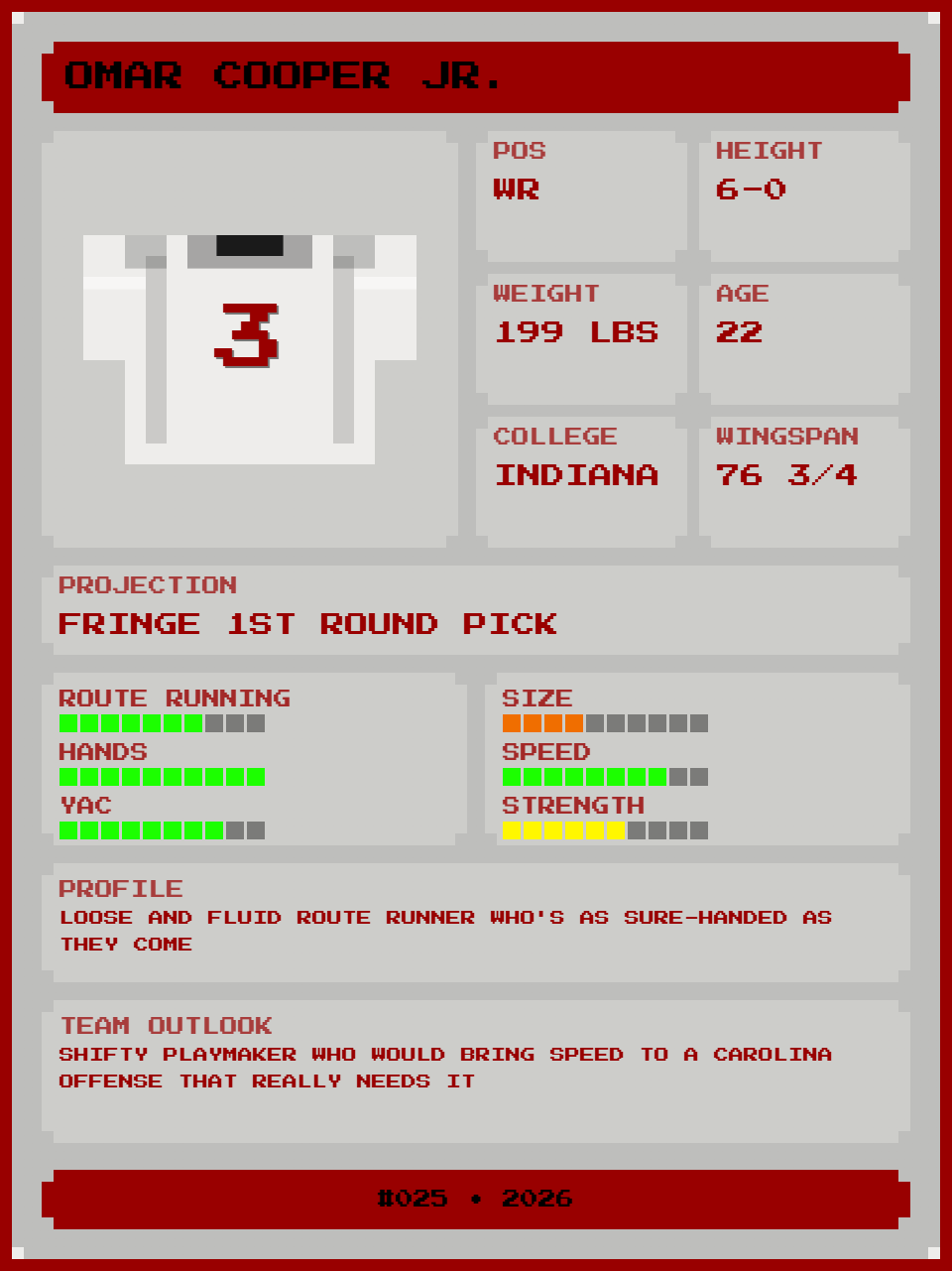 Cooper also doesn’t fit into the traditional WR mold that the Canales/Morgan regime has targeted recently. All of Tetairoa McMillan, Xavier Legette, and Jalen Coker are listed at 6’3+ or above and 210+ lbs.