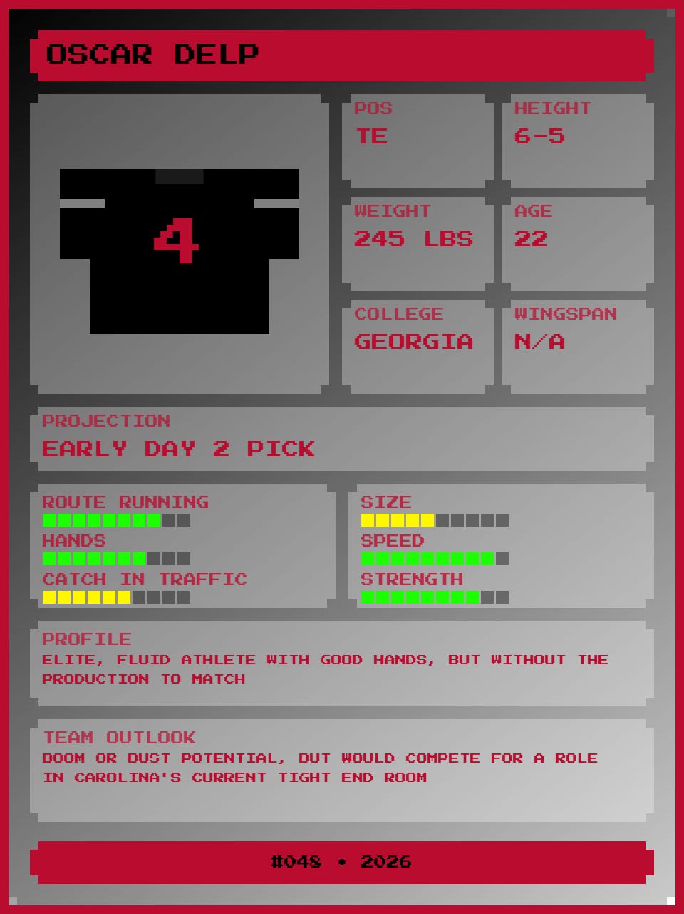 Draft fans are catching on to Delp as a prospect due to his recent success at Georgia’s pro day, but SEC fans have known how good he is all along. Delp is a legitimate receiving threat who can create after the catch. He is a plus blocker as well, giving the Panthers a perfect 12 personnel player (Carolina was 17th in 12 personnel rate in 2025 per FTN). This pick might seem a bit rich, but I’d be willing to bet Delp goes much higher than the consensus board has him right now.