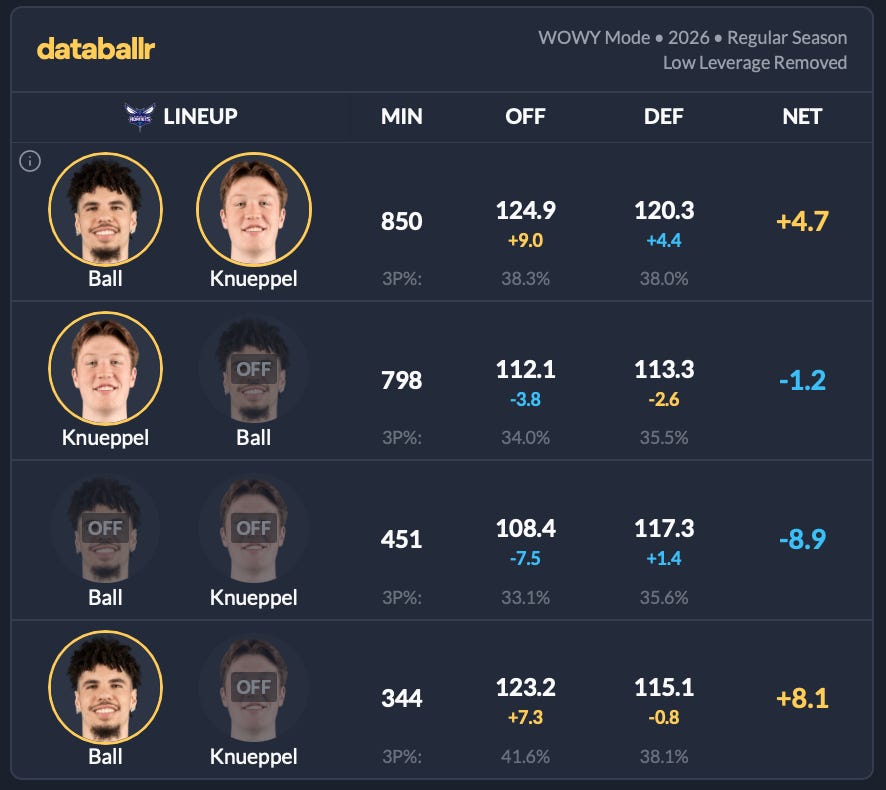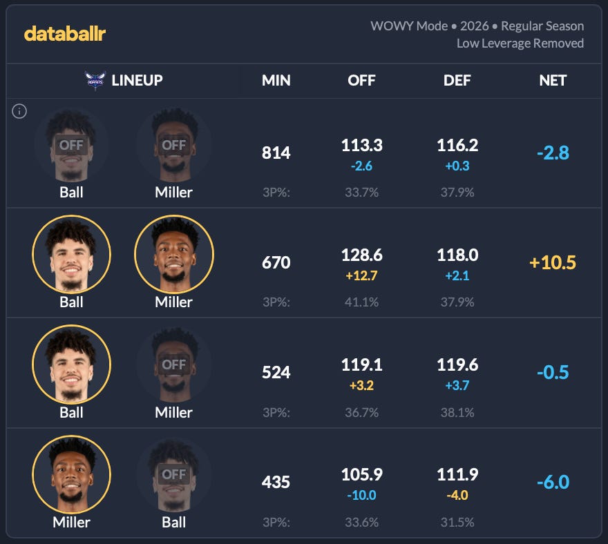 Moreover, the Hornets’ other two core players’ net rating drops dramatically without Ball on the floor.