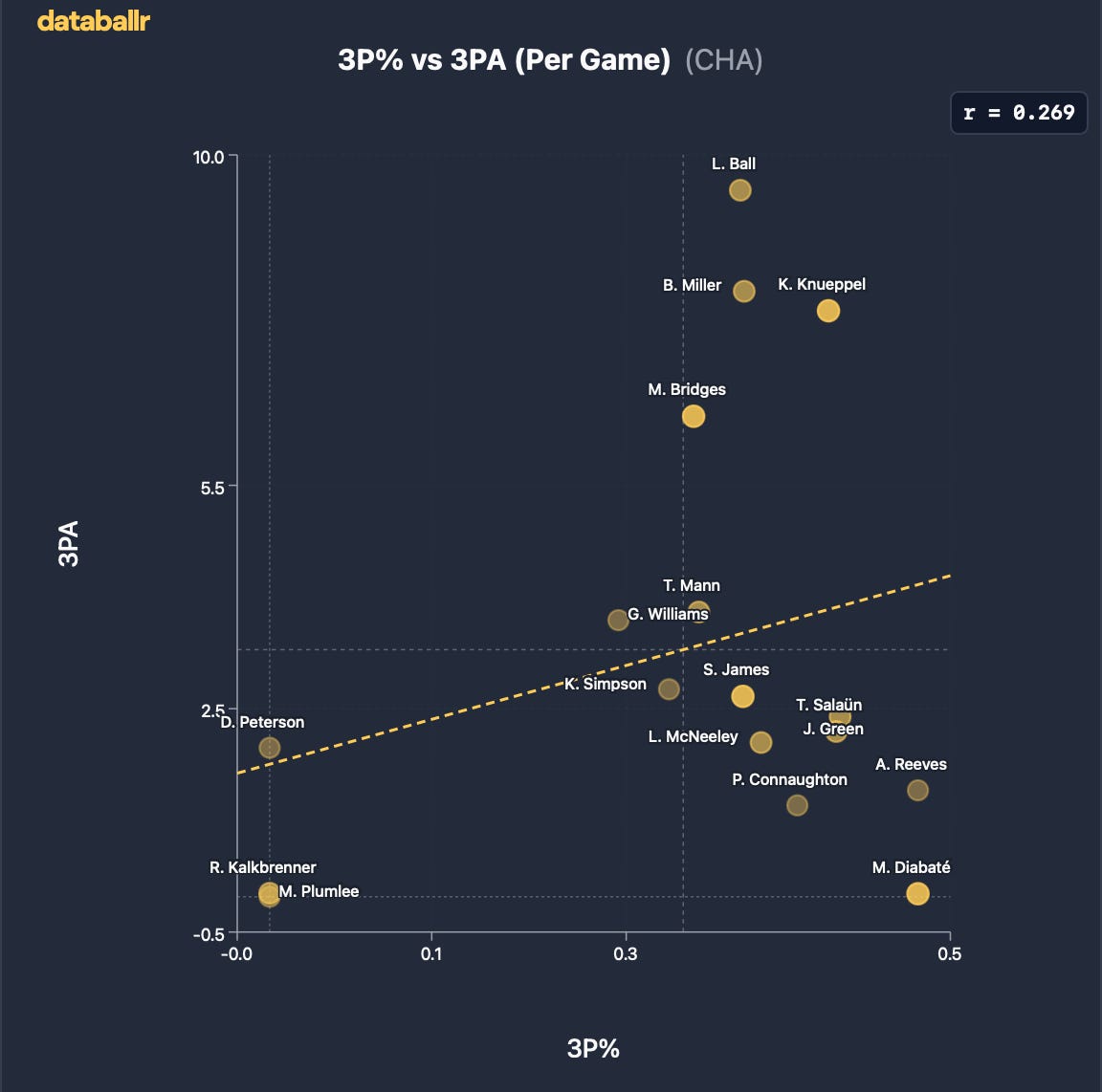 And if you have the shooters, it just mathematically makes sense to do so. As of the date that I’m writing this, each of LaMelo Ball (9.4), Brandon Miller (8.3), Kon Knueppel (8.0), and Coby White (7.2) are among the NBA’s top-20 players in 3-pointers attempted per game.